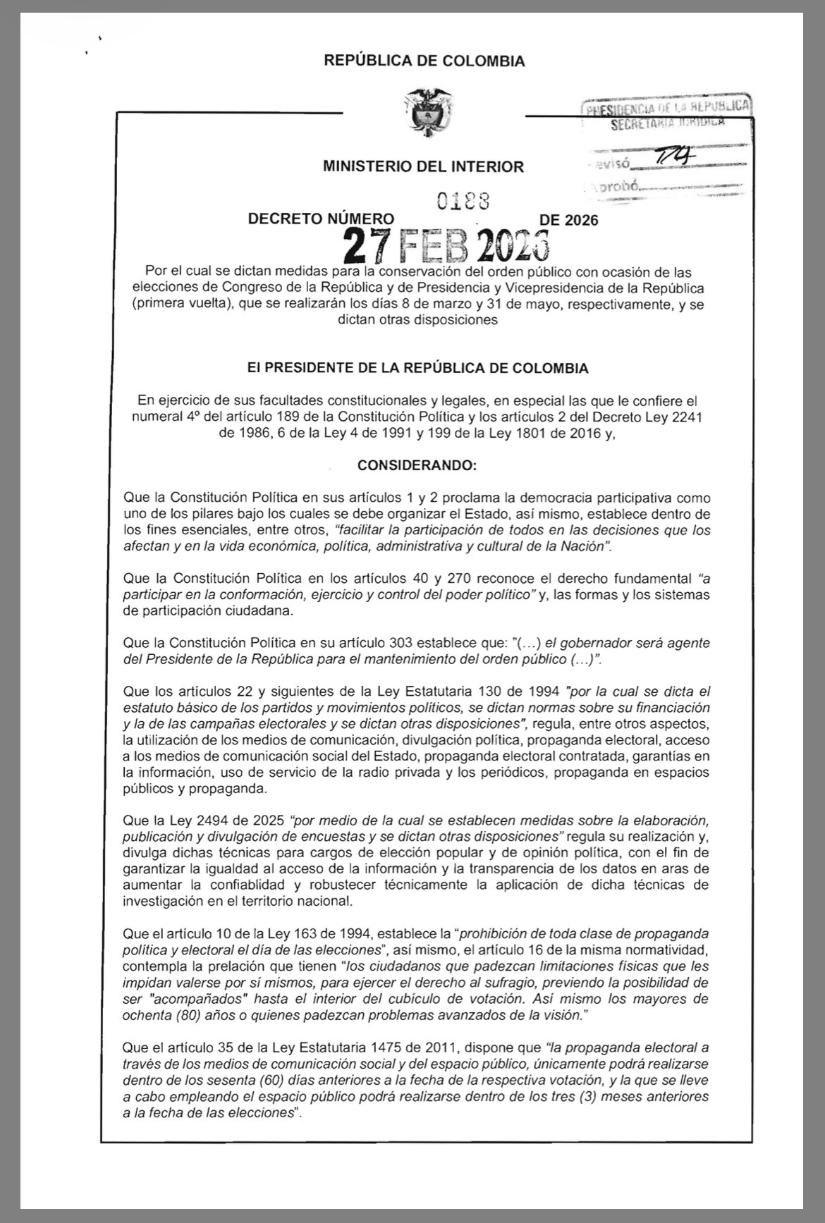 El Gobierno nacional expidió el Decreto 0188 del 27 de febrero de 2026, mediante el cual adoptó medidas especiales de orden público para garantizar el normal desarrollo de las elecciones legislativas previstas para el 8 de marzo y la primera vuelta presidencial del 31 de mayo.